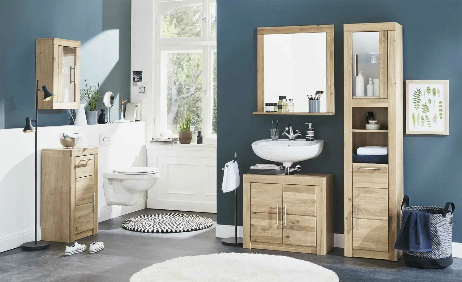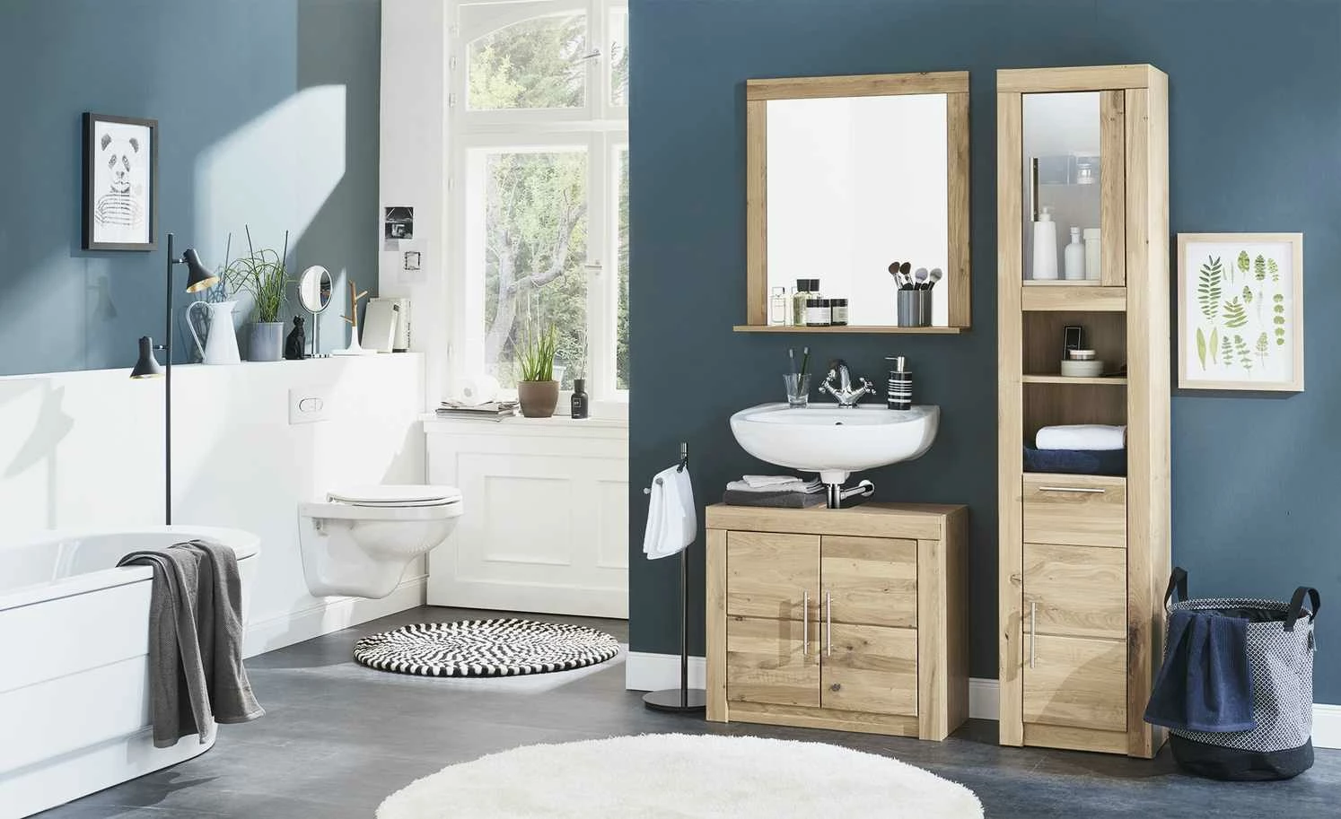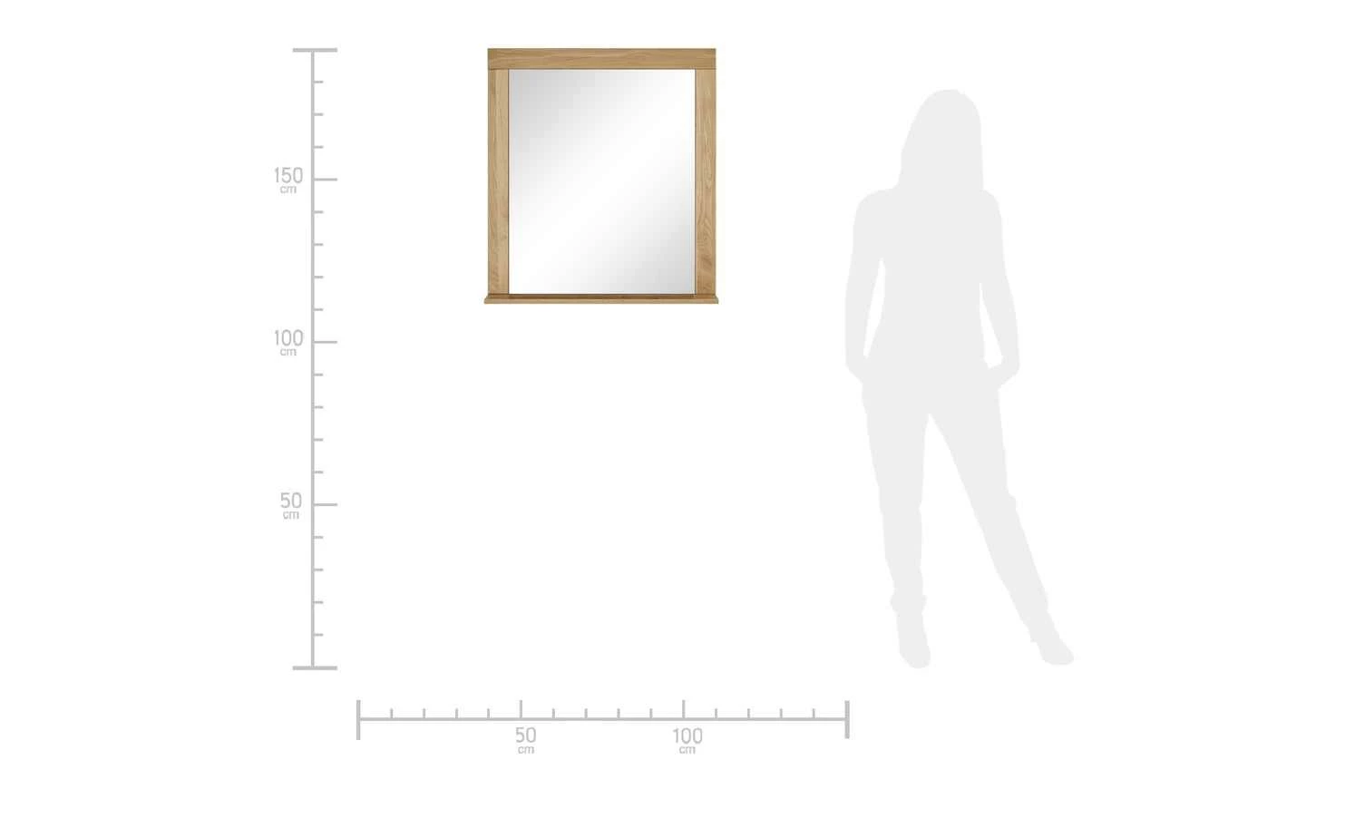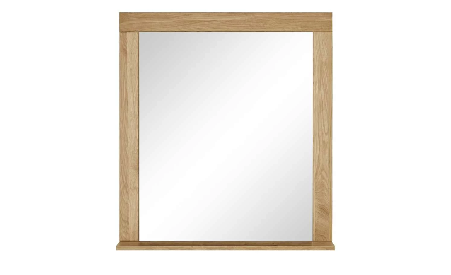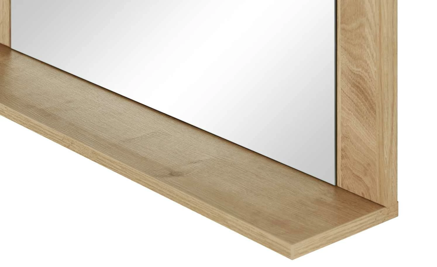 Die Badezimmerserie Oslo können Sie mit diesem Bad-Spiegel ergänzen. Die große Spiegelfläche wird von massiver Wildeiche umrandet. Der untere Rand geht in ein Ablageboard über. Es ist etwas zehn Zentimeter tief – und bietet Platz für Pflegeprodukte und Kosmetika. Passend zum Rahmen hat die Ablage ein Dekor in Wildeiche (Nachbildung).