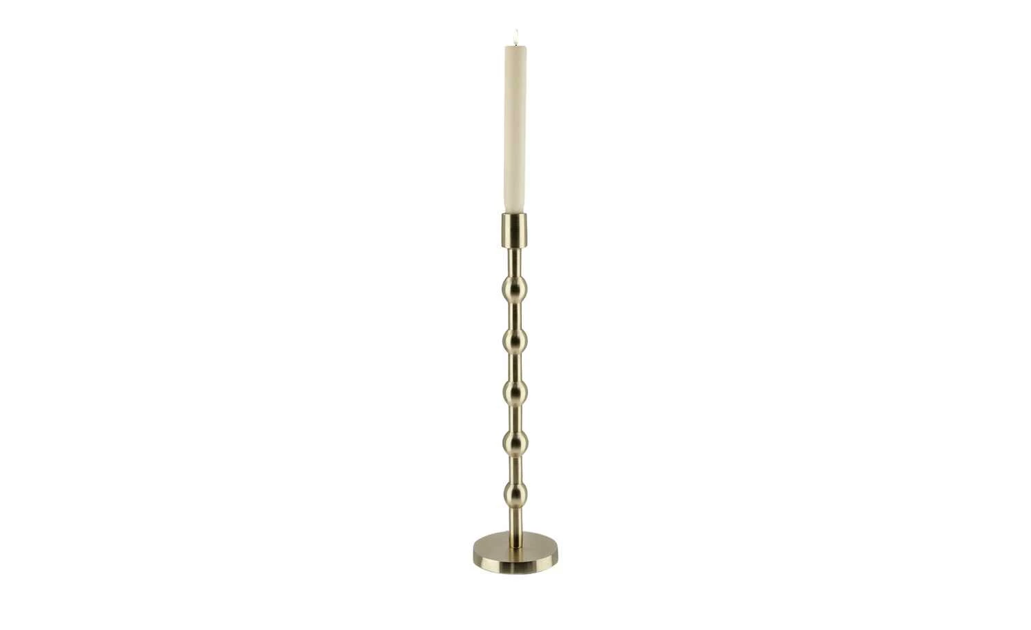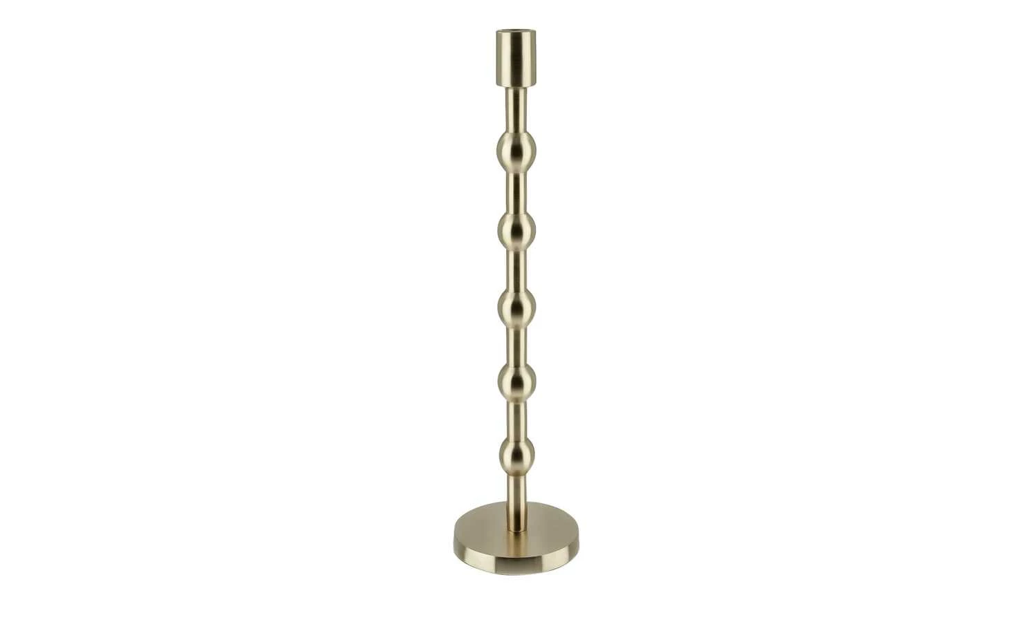 Entdecken Sie jetzt die zweite Influencerkollektion, die mit Cita Maass exklusiv für Höffner designt wurde. Die Kollektion greift Elemente des Boho-Stils auf und verströmt einen ganz besonderen Charme. Der goldfarbene Kerzenständer ist modern, edel und mühelos mit nahezu allen Kerzenfarben kombinierbar. Je nach Höhe des Kerzenständers verzieren zwei, drei oder fünf kugelförmige Verdickungen den Standfuß. Nutzen Sie den trendigen Kerzenhalter zum Beispiel mit roten Kerzen, um ein weihnachtliches Ambiente zu schaffen.