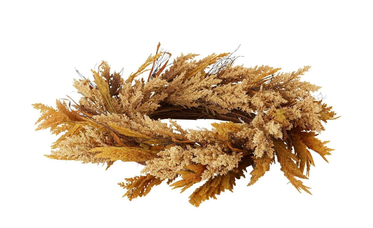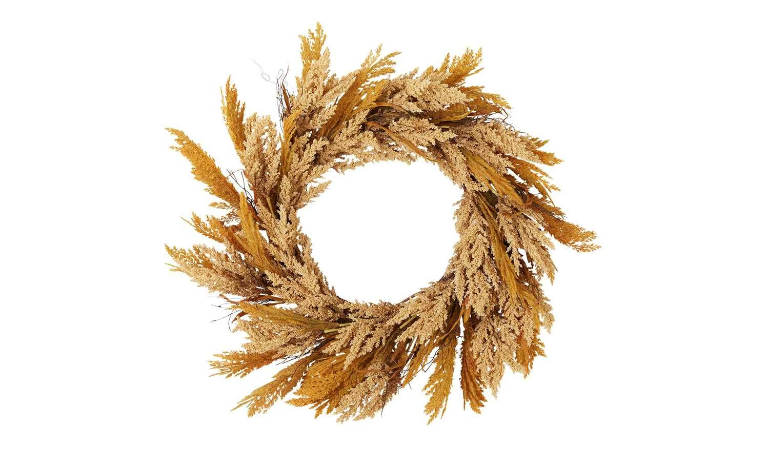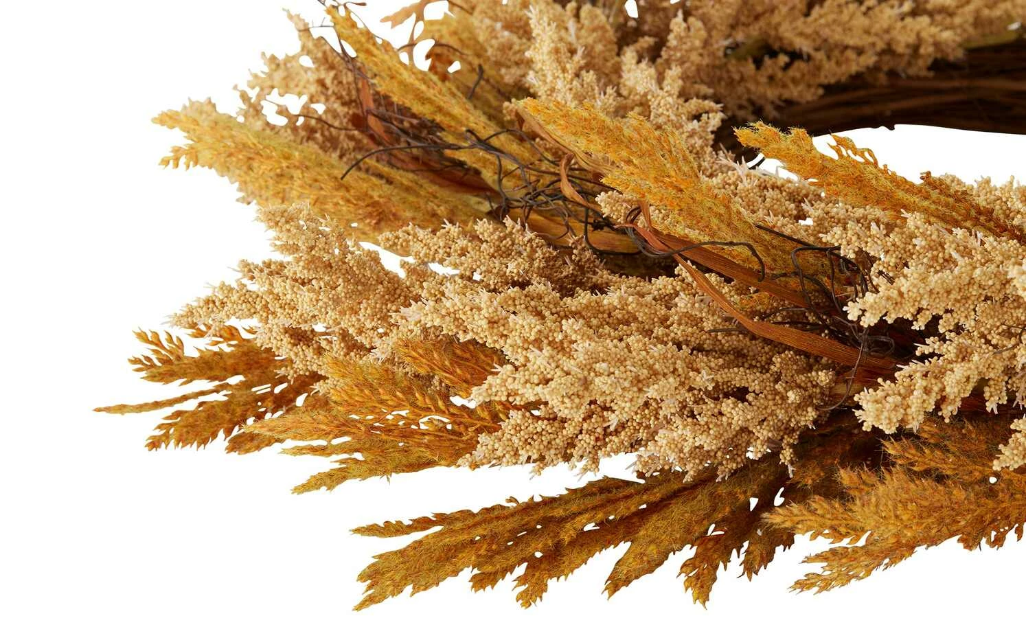 Dieser 71 Zentimeter große Deko-Kranz besteht aus einem natürlichen Ensemble aus japanischem Kletterfarn, Weizen-Ähren und weiteren getrockneten Naturmaterialien. Hängen Sie ihn im Spätsommer oder im Herbst auf: Je nachdem, wie Sie den Kranz kombinieren, kann er für beide Jahreszeiten verwendet werden. Übrigens: Platzieren Sie den Kranz auf einer Kommode oder dem Esstisch und drapieren Sie weitere Deko-Elemente im und um den Kranz. So entsteht eine attraktive herbstliche Tischdeko.