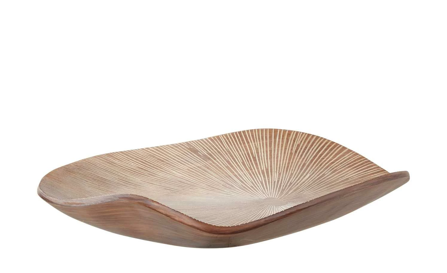 Die hübsche Deko Schale Circle eignet sich gut als Dekorationsgegenstand auf dem Tisch, einem Regal oder einer Anrichte. Sie besitzt eine rechteckige Grundform mit abgerundeten, wellenförmigen Rändern und ist in einem attraktiven Holzton gehalten. Auf der Innenseite des Modells befindet sich ein Muster aus hellen Linien, welches von der Mitte aus strahlenförmig nach außen verläuft. Die asymmetrische Grundform sorgt für Lebendigkeit und verleiht der Schale einen ganz eigenen Charme. Sie können sie auch im Küchenbereich als Aufbewahrungsort für Kleinutensilien kommt sie optimal zur Geltung.