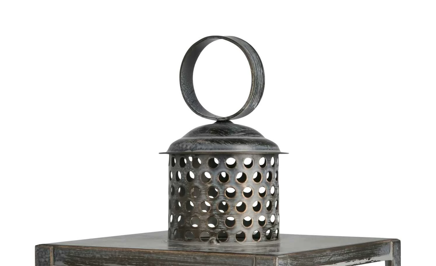 Genießen Sie gemütliche Stunden auf dem Balkon oder auf dem Sofa: Diese stilvolle Laterne sorgt mit der passenden Stumpenkerze für das passende Ambiente. Das unempfindliche Metallgehäuse ist mit einem Vintage-Finish versehen und passt dadurch zu diversen Einrichtungsstilen. Ein kleiner runder Griff rundet das Erscheinungsbild gekonnt ab und erleichtert den Transport, falls Sie die Laterne in mehreren Räumen nutzen wollen.