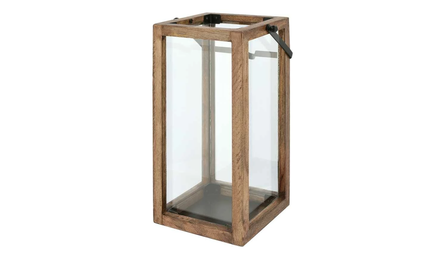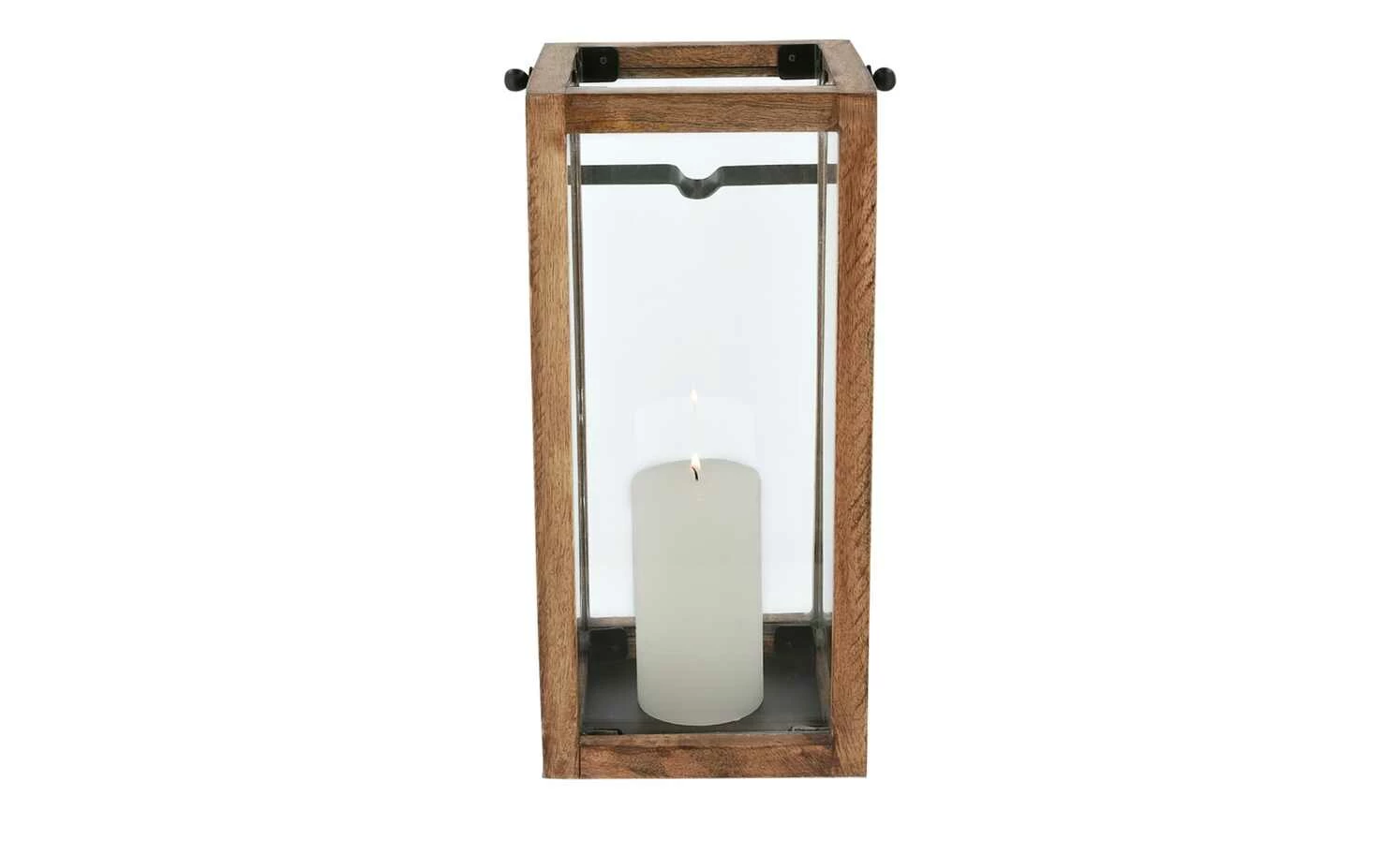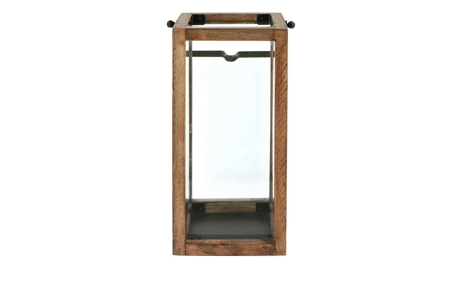 Echtes Mangoholz umrahmt diese quaderförmige Laterne. Die Außenwände sind mit Klarglas versehen, sodass der Innenbereich von allen Seiten gut einsehbar ist. Dadurch kommen gemusterte oder bunte Stumpenkerzen besonders gut zur Geltung. Sowohl der schmale Griff, als auch der Boden der Laterne ist aus schwarzem Metall, sodass ein stimmiges Zusammenspiel mit dem Mangoholz entsteht.