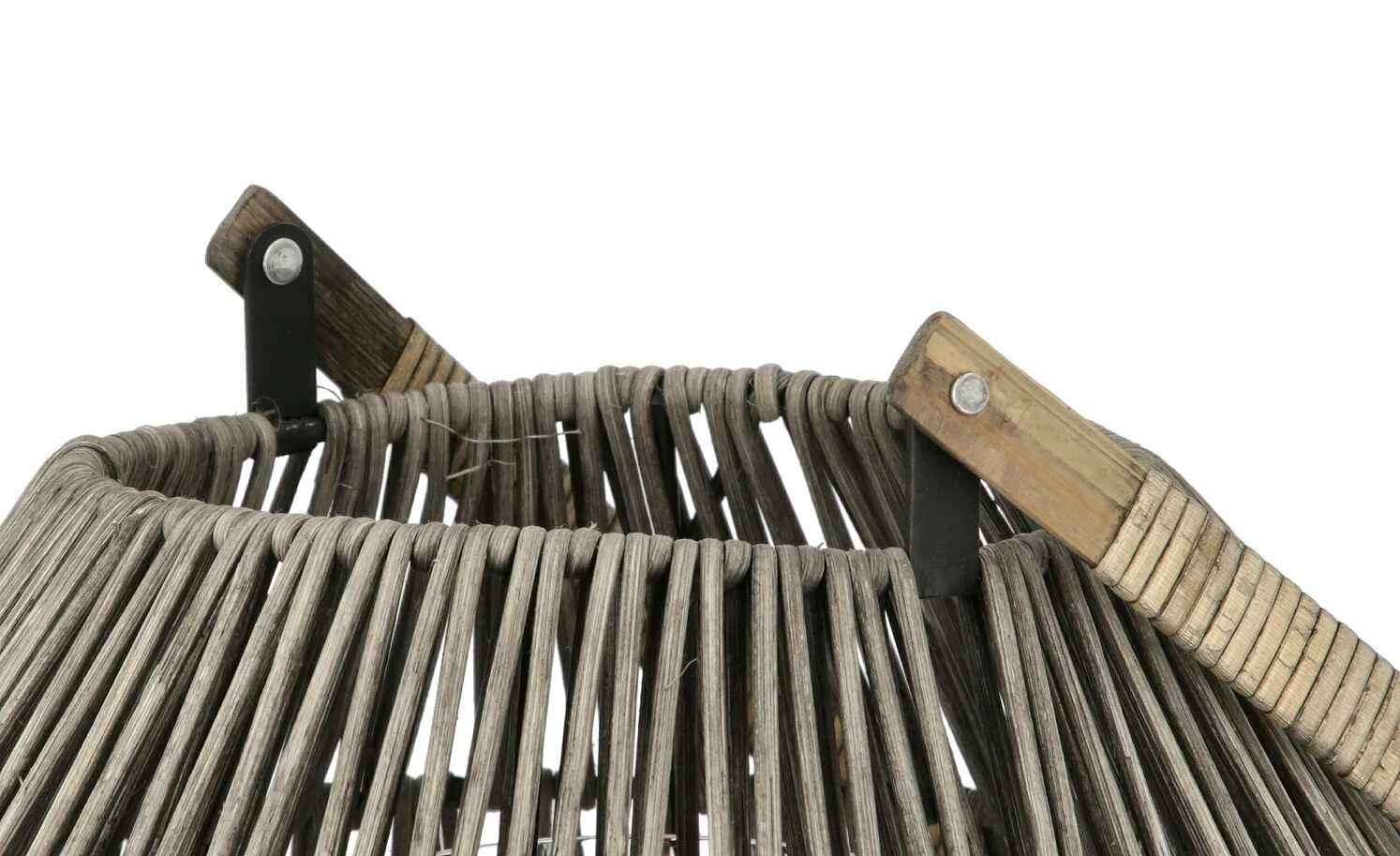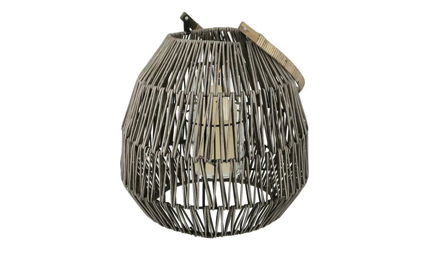 Dunkelgraues Rattan verströmt bei dieser Laterne ein attraktives Strandflair. Das Geflecht umspannt ein stabiles Metallgestell, hinter dem sich der Glaseinsatz für eine Stumpenkerze oder ein Teelicht verbirgt. Ein heller Rattangriff hebt sich vom Gestell ab und erleichtert den Transport der Laterne.