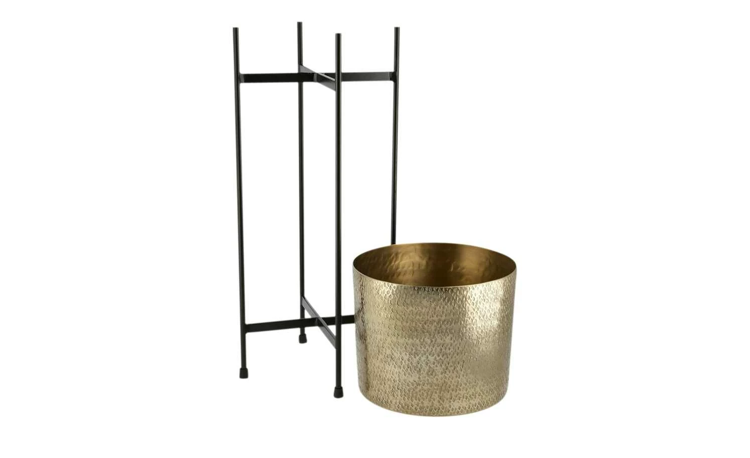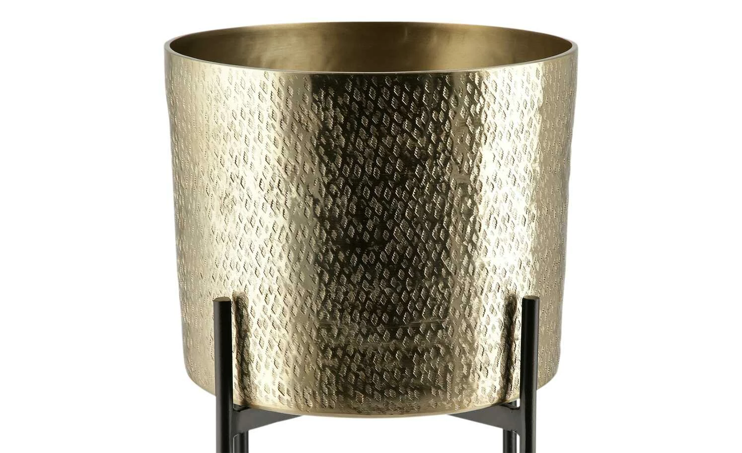 Elegantes, loftiges Ambiente erschaffen Sie mit edlen It-Pieces wie diesem Blumentopf. Das Gestell aus schwarzem, robustem Eisen trägt einen goldfarbenen Topf, in dem Sie Pflanzen in Szene setzen können. Dieser besteht aus pflegeleichtem Aluminium und besitzt eine attraktive Struktur auf der Gefäßaußenseite. Bei Lichteinfall schimmert der Topf besonders schön. Unser Tipp: Platzieren Sie unterschiedlich hohe Töpfe dieser Art nebeneinander, um einen Blickfang in Ihrem Wohnraum zu schaffen.