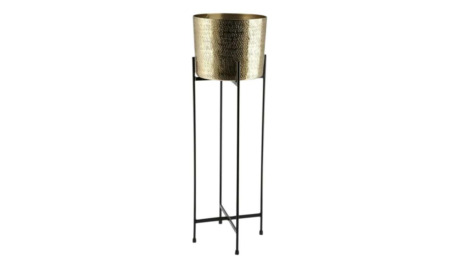 Elegantes, loftiges Ambiente erschaffen Sie mit edlen It-Pieces wie diesem Blumentopf. Das Gestell aus schwarzem, robustem Eisen trägt einen goldfarbenen Topf, in dem Sie Pflanzen in Szene setzen können. Dieser besteht aus pflegeleichtem Aluminium und besitzt eine attraktive Struktur auf der Gefäßaußenseite. Bei Lichteinfall schimmert der Topf besonders schön. Unser Tipp: Platzieren Sie unterschiedlich hohe Töpfe dieser Art nebeneinander, um einen Blickfang in Ihrem Wohnraum zu schaffen.