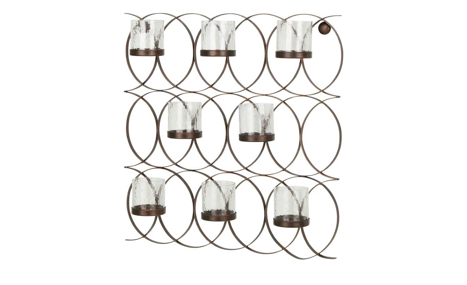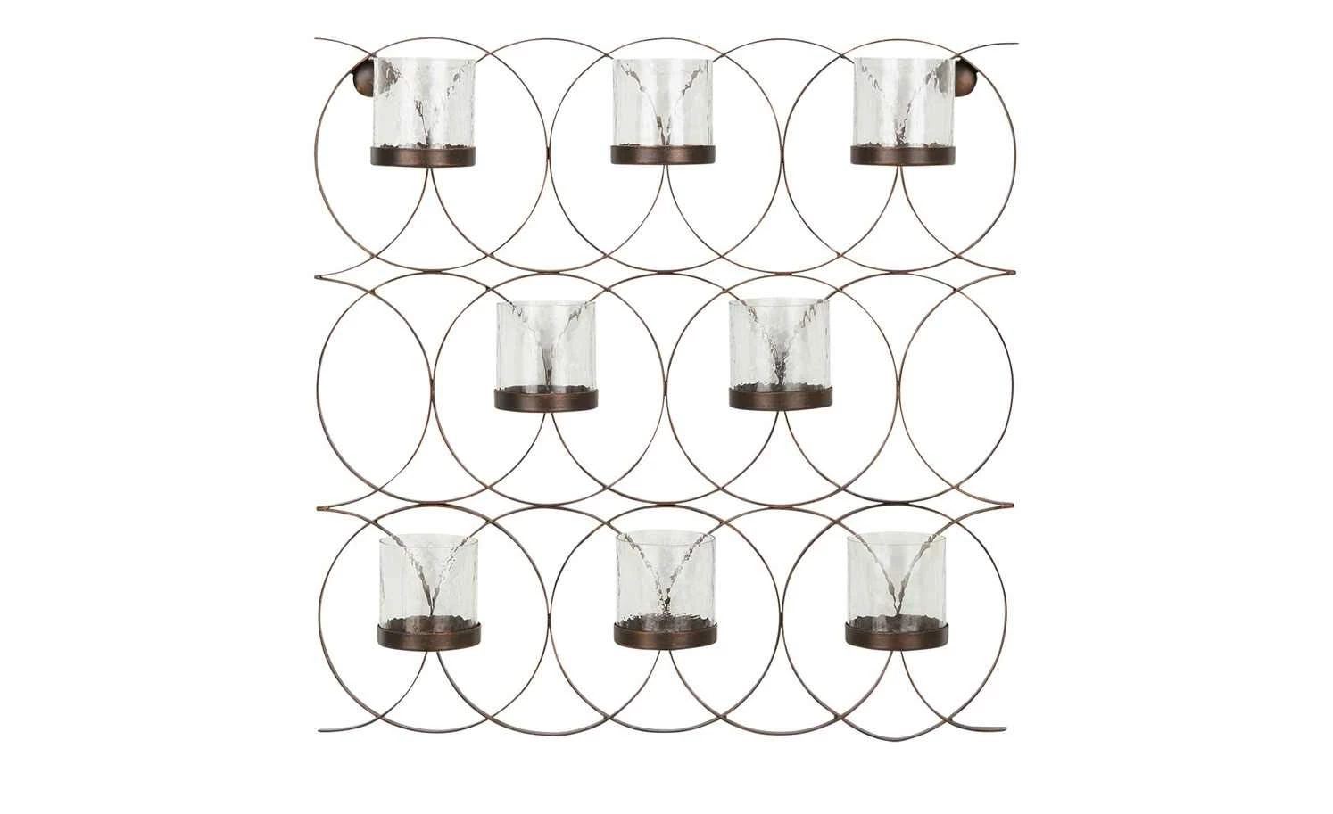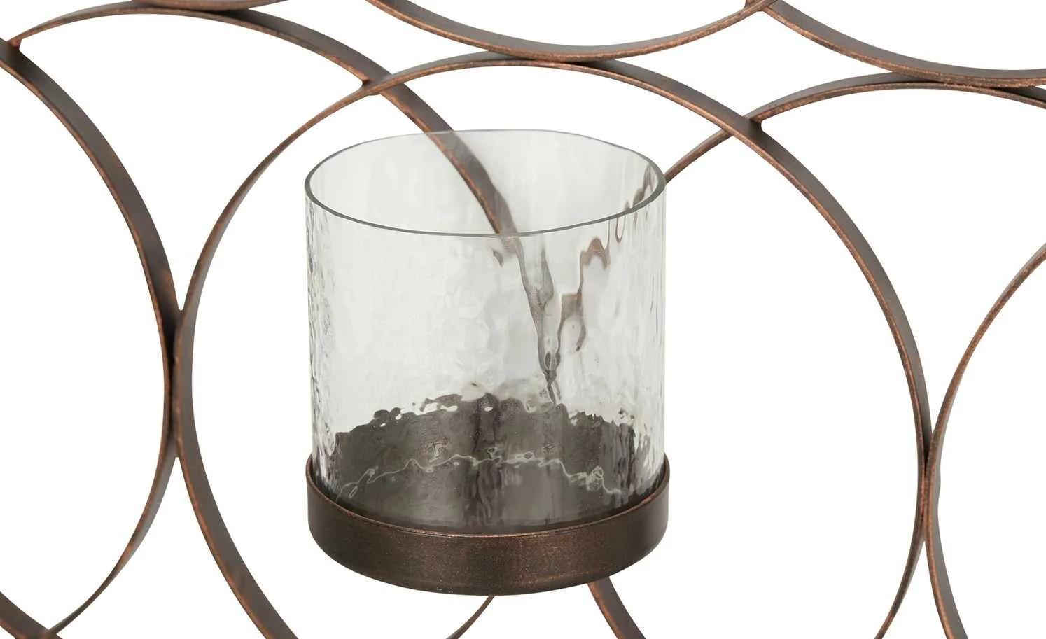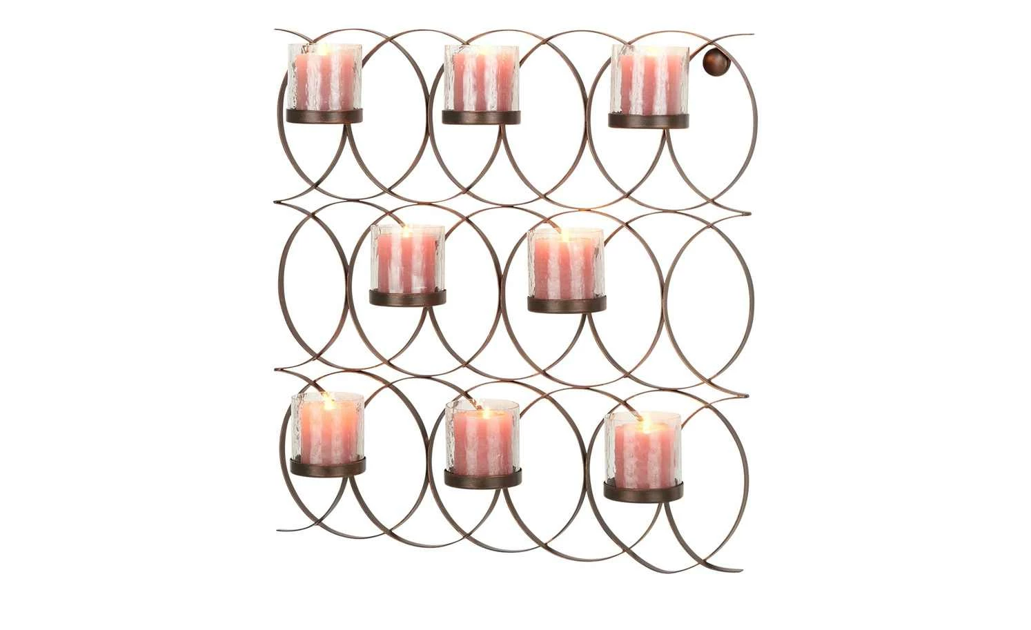 Filigran, kunstvoll und für ein stilvolles Ambiente: Mit diesem Wandlicht werden die Abende noch gemütlicher. Das kupferfarbige Metallgestell besteht aus vielen gleichgroßen Kreisen, vor denen versetzt Platz für insgesamt acht Kerzen ist. Ob Sie Teelichter oder kleine Stumpenkerzen nehmen, bleibt dabei ganz Ihnen überlassen. Unser Tipp: Farbige Kerzen kommen in diesem Wandwindlicht besonders gut zur Geltung.