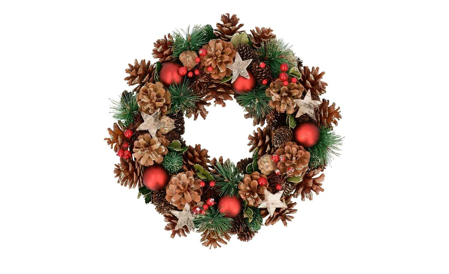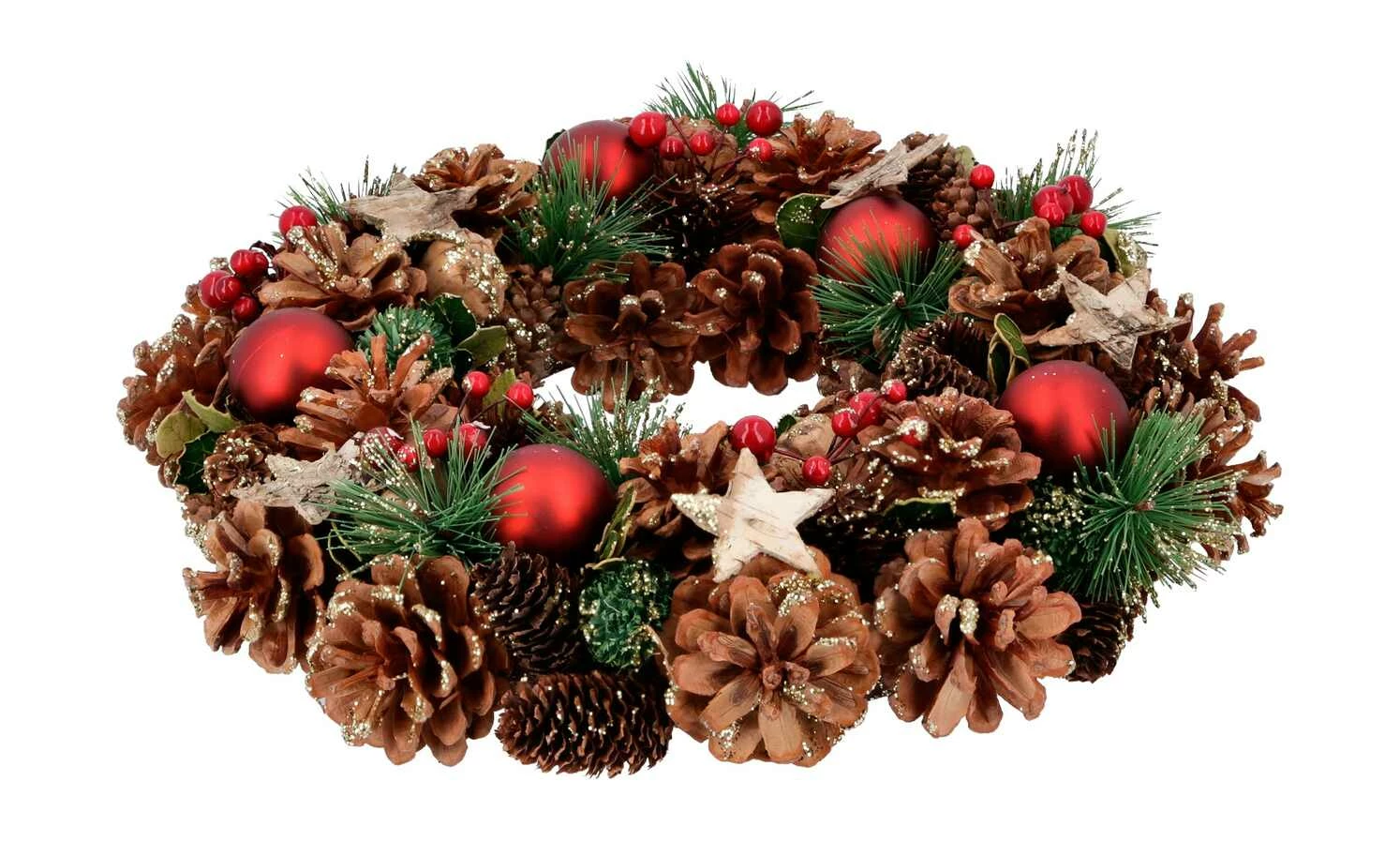 - Mehr zu Ausstattung / Funktion: Tannenzapfen, Blättern und Holzsternen, roten Kunststoffkugeln