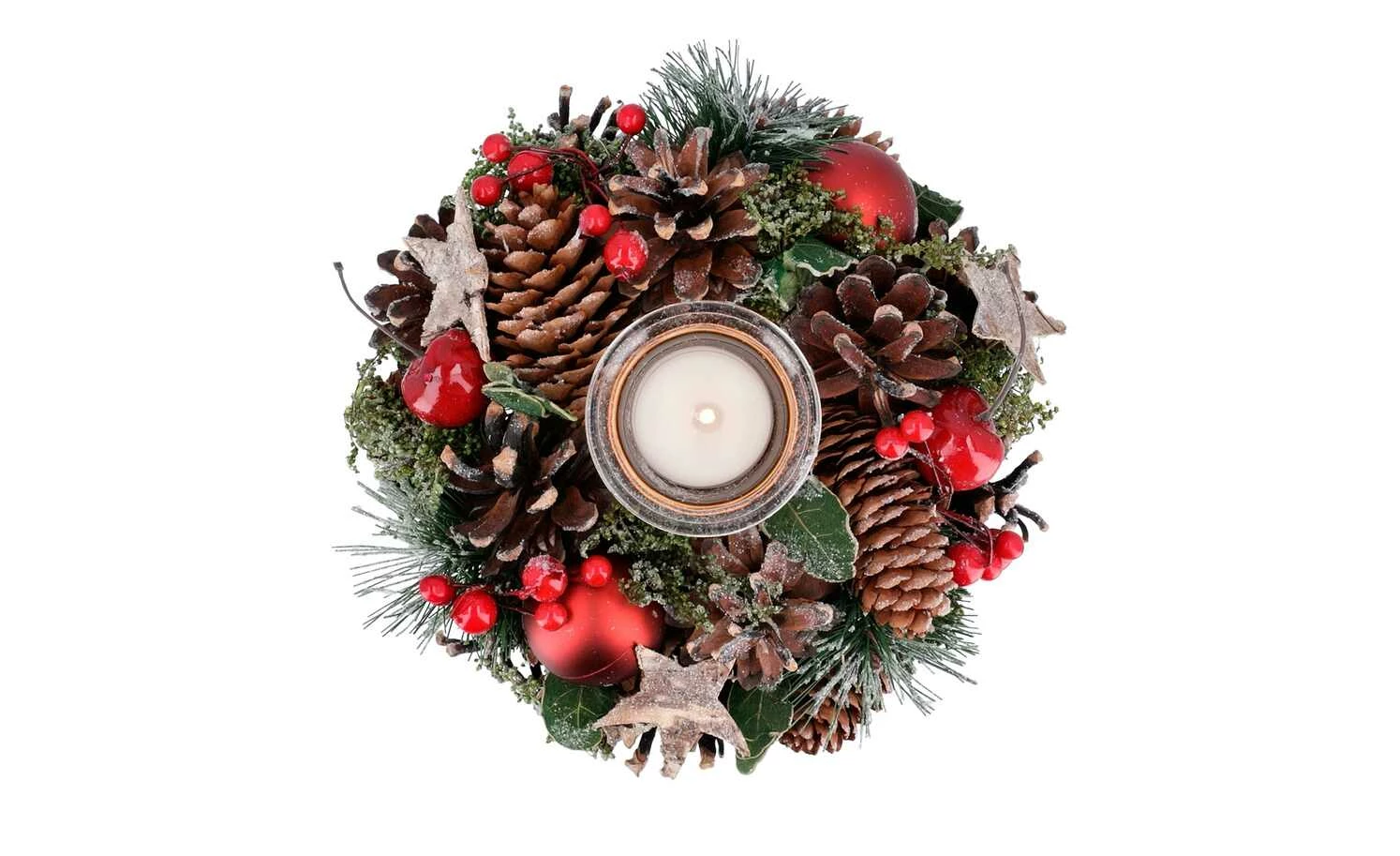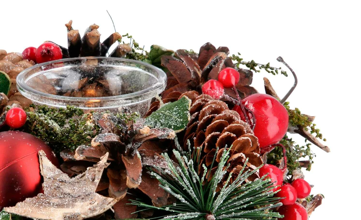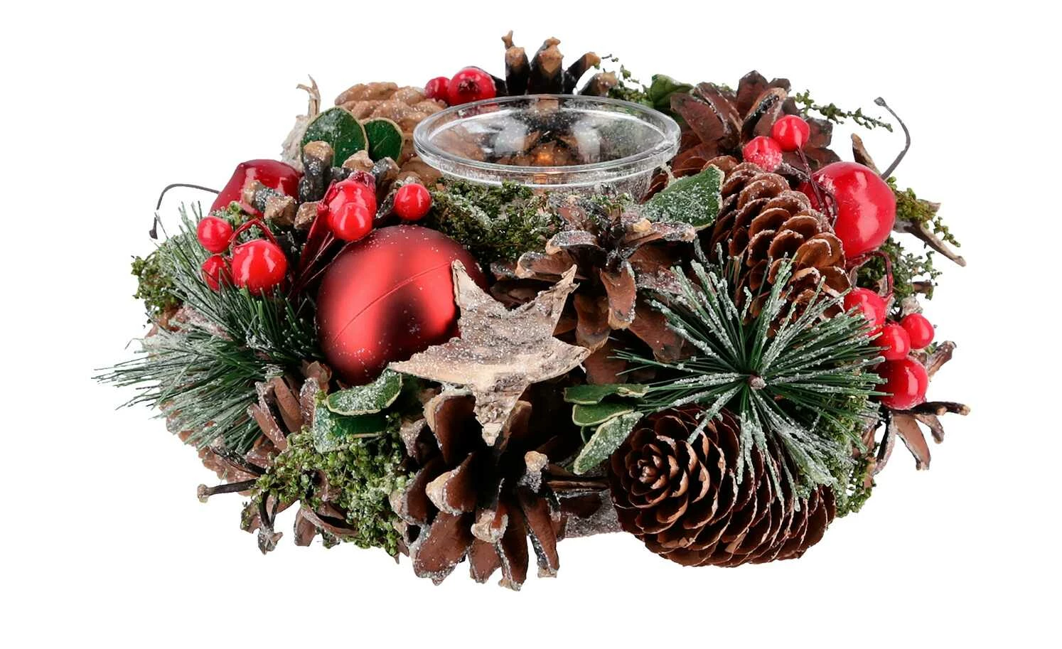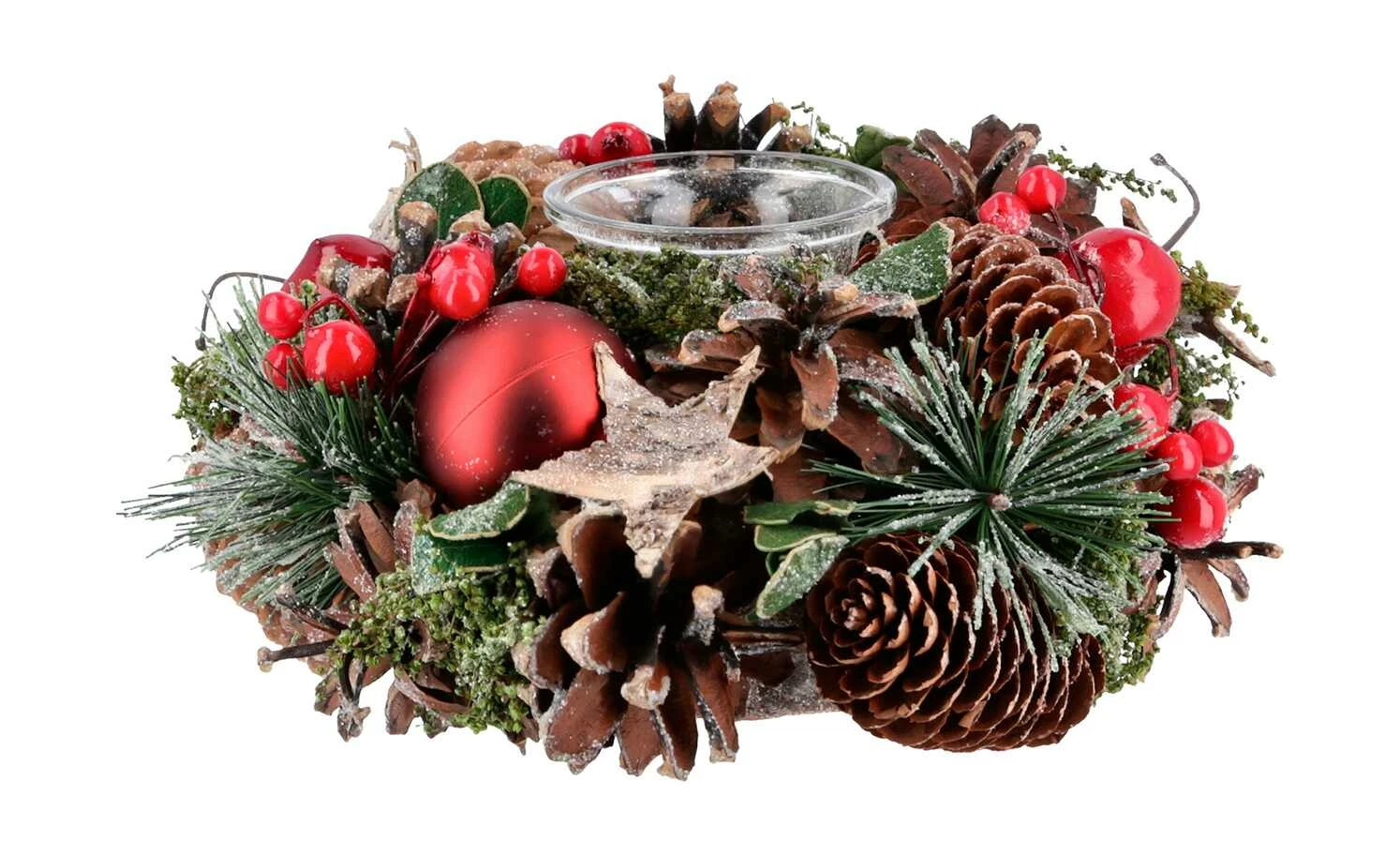 - Mehr zu Ausstattung / Funktion: roten Kunstsoffkugeln, geeignet für 1x Teelicht, Tannenzapfen, Blättern und Sternen