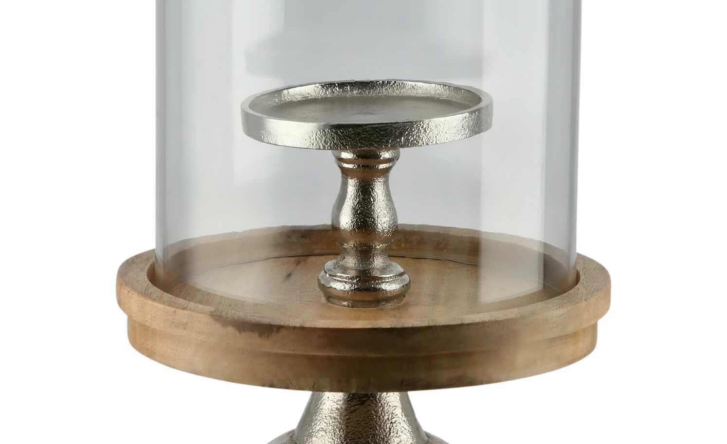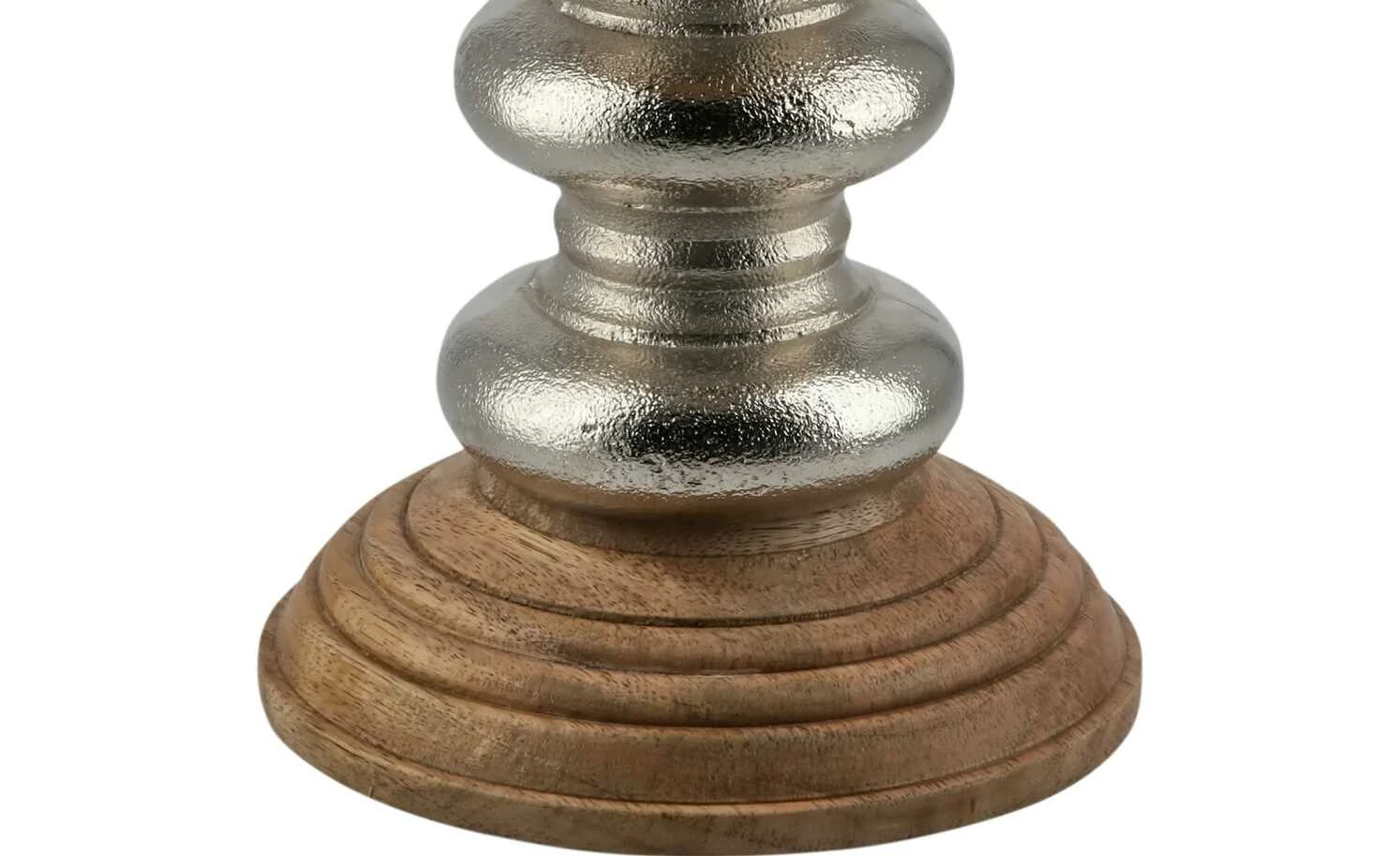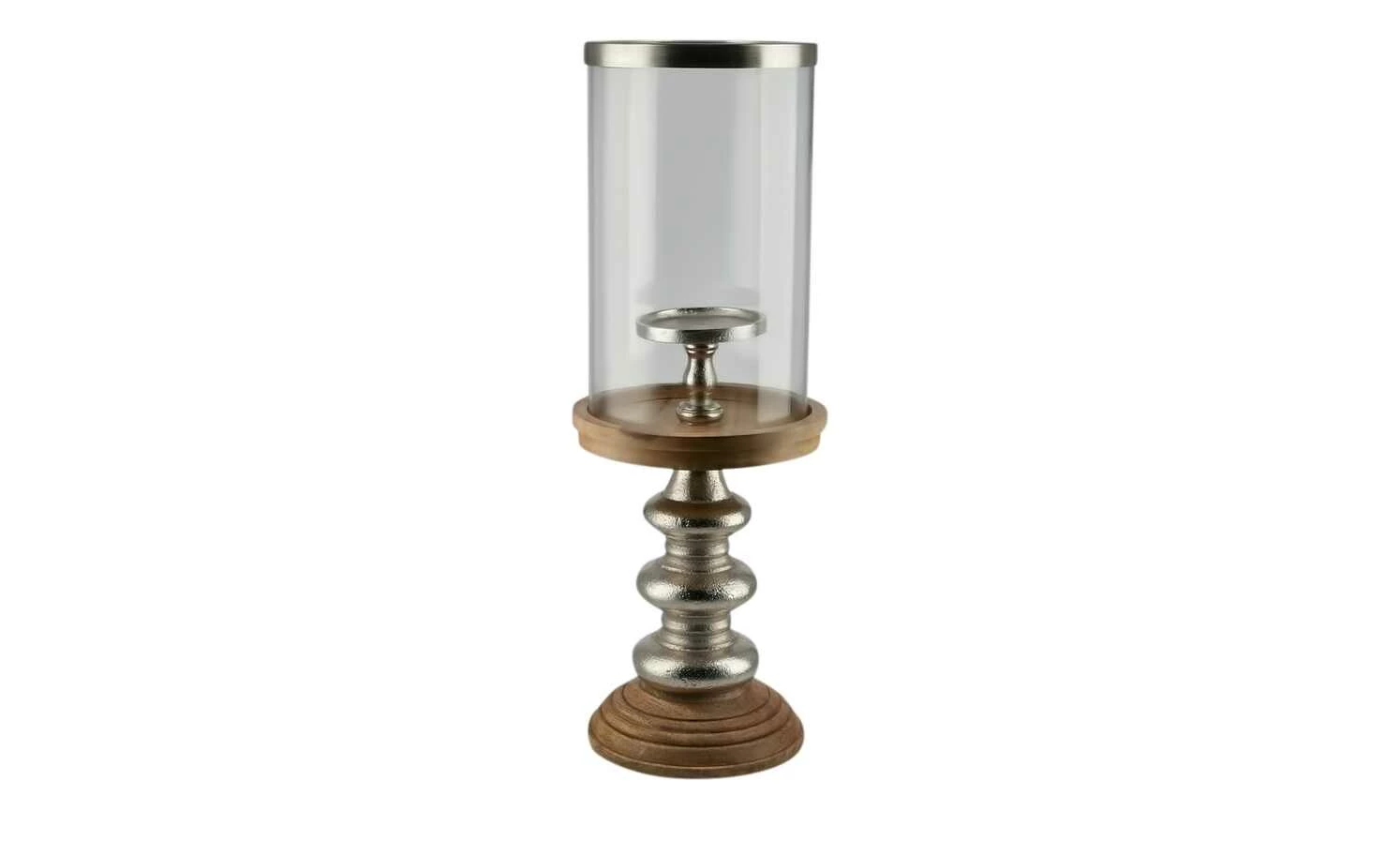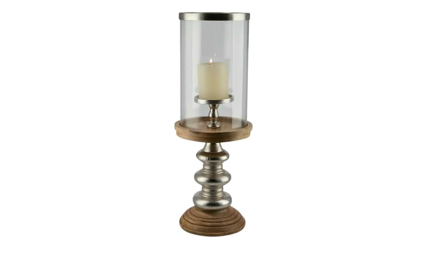Bei diesem Windlicht harmoniert echtes Mangoholz mit silberfarbenem Aluminium. Der dekorative Standfuß trägt den Glaszylinder mit einem Durchmesser von 15 Zentimetern. Dieser schützt innenliegende Stumpenkerzen, aber auch Teelichter zuverlässig vor Zugluft. Das insgesamt 43 Zentimeter hohe Windlicht passt in diverse Einrichtungsstile und macht sich gut als ambientvolles It-Piece auf Sideboards oder Couchtischen.