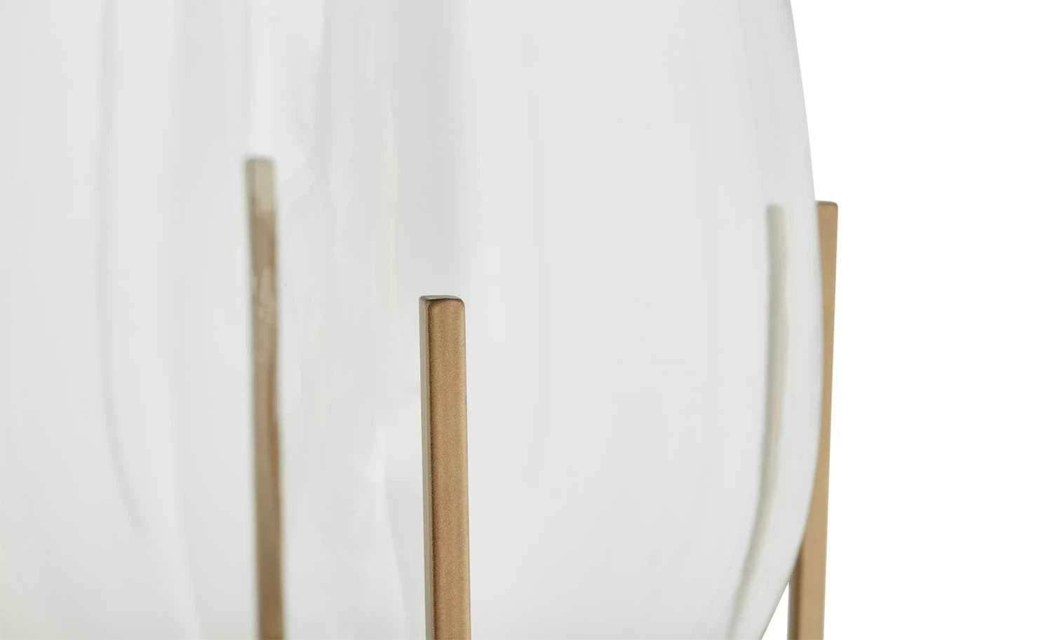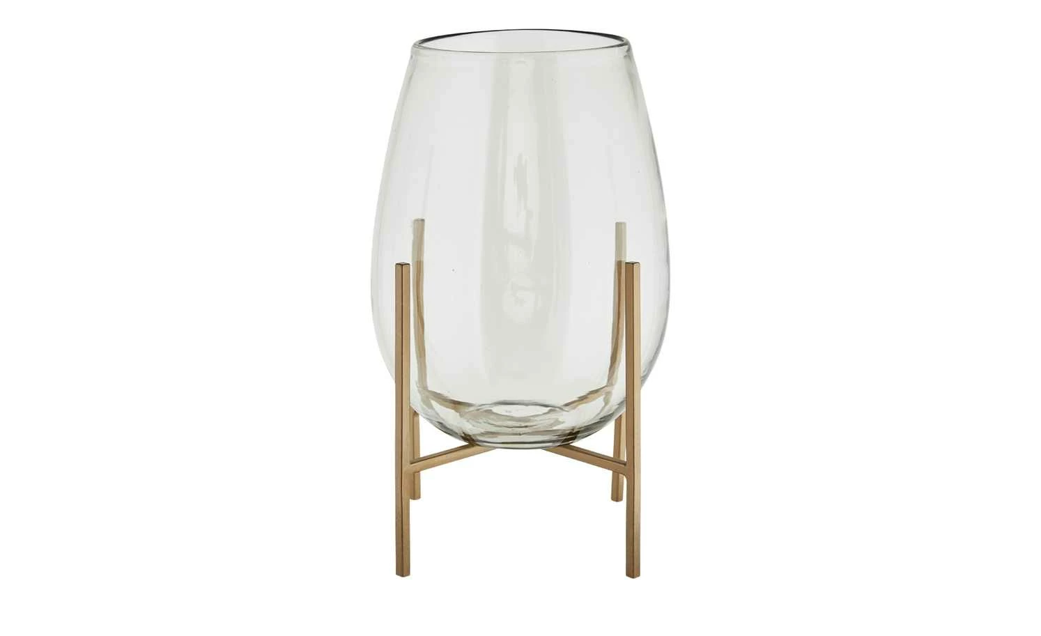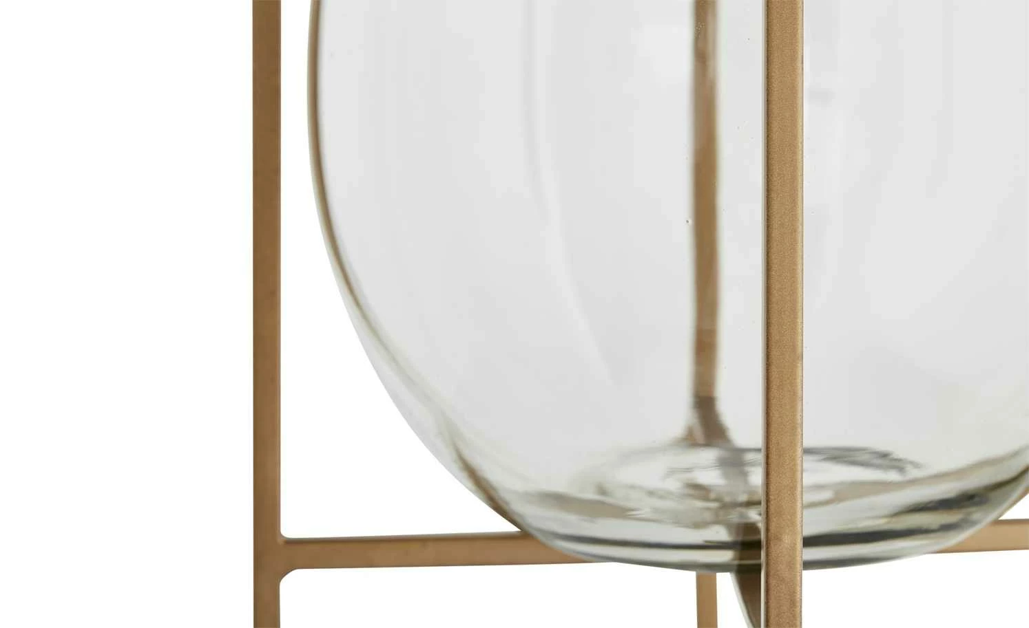 Das Windlicht scheint auf dem goldfarbenem, filigranen Metallgestell regelrecht zu schweben. Das nahezu tropfenförmige Glas ruht in seinem Gestell und schützt jede Kerze zuverlässig vor Wind.